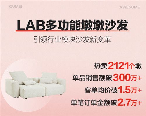 凭借灵活的组合性、实用的多功能设计和高度的定制性,2023年,墩墩沙发迅速获得市场认可——热卖2121个墩、单品销售额破300万、客单均价破1.5万、单笔订单金额破2.7万。成为众多消费者的心选家居好物。目前,曲美LAB已拥有墩墩沙发、多功能桌、多功能床等多类产品,后续还将有更多空间家具陆续上线。
