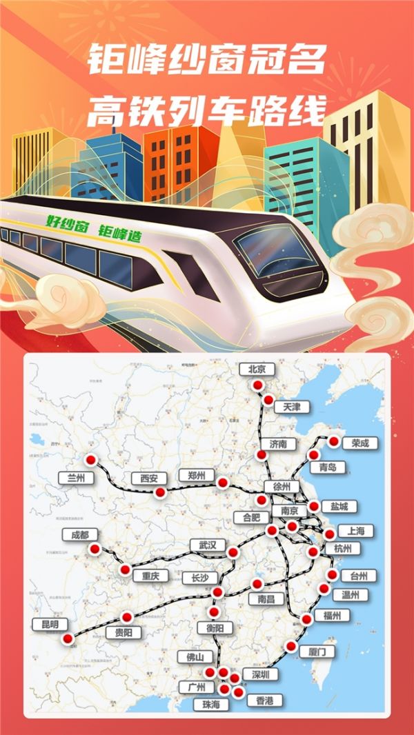 据了解,本次钜峰纱窗冠名的高铁列车,以上海为中心,重点覆盖长三角地区,并延伸至华南、华北、西南地区,自1月5日起,这些高铁列车将穿越沿线诸多城市,成为一道高速传递的品牌“名片”,再次为钜峰纱窗这匹行业黑马带来前所未有的品牌曝光度。