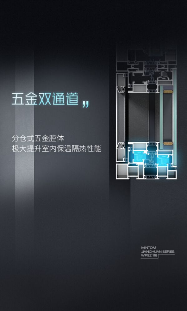 与以往产品相比,明樘见川 118极窄外开窗在设计上有了更大的突破,五金和铰链由一个腔体变为两个独立的腔体设计,分仓式的五金腔体,极大程度的提升了保温隔热性能。