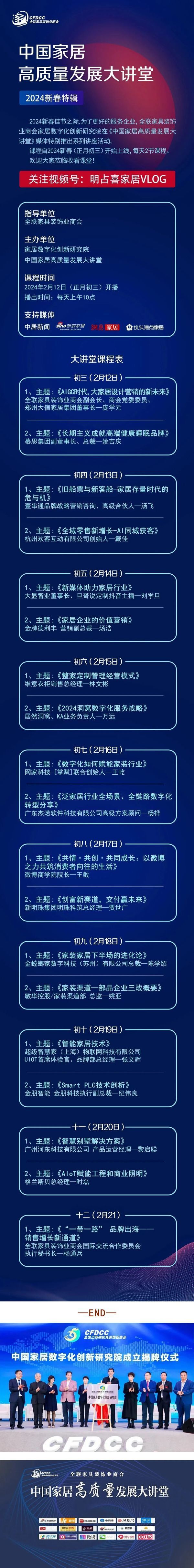 为深入积极贯彻党中央、国务院关于开展制造强国、质量强国的重大决策部署,落实全国工商等四部委关于推进《家居产业高质量发展行动方案》及商务部等13部门关于《促进家居消费若干措施》文件的指示与精神,赋能中国家居产业高质量发展,全联家具装饰业商会,家居数字化创新研究院,中国家居高质量发展大讲堂在2024年春节期间推出《知识赋能 赢在2024》系列家居产业知识讲座活动。由家中国居行业企业家,新零售平台,智能家居等企业负责人会同行业专家、职业经理人、学者,走上线上大讲堂,分享品牌建设,数字化赋能、新媒体运营、整装大家居、智能家居技术经验与成功案例,赋能中国家居行业高质量发展。大讲堂将在正月初三上午十点至正月十二准时开播,欢迎收看请关注视频号 明占喜家居VLOG