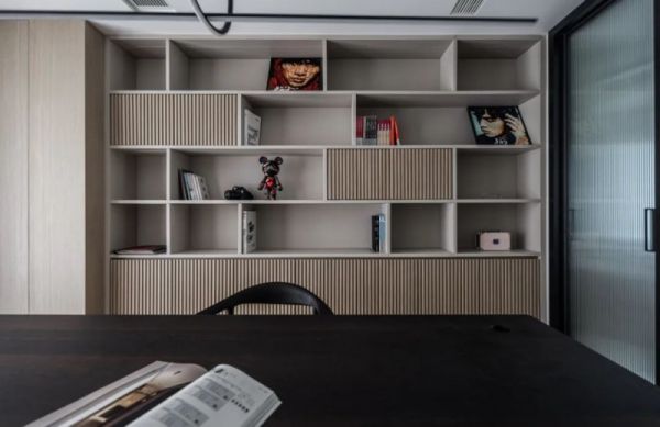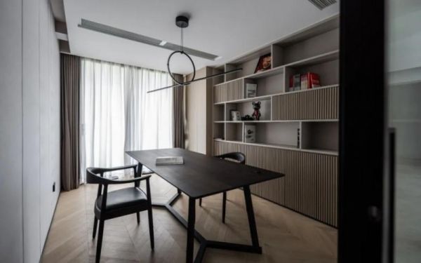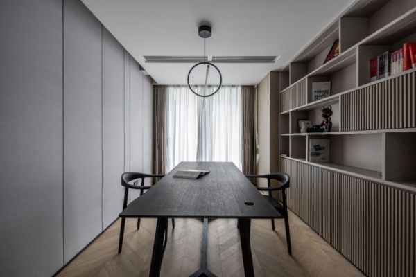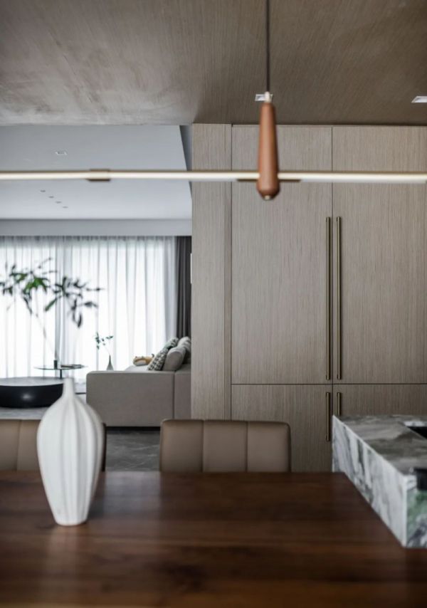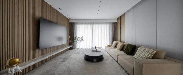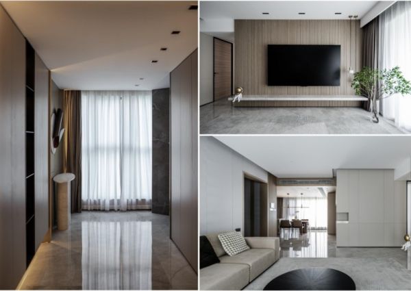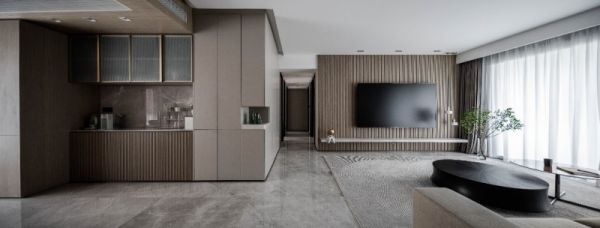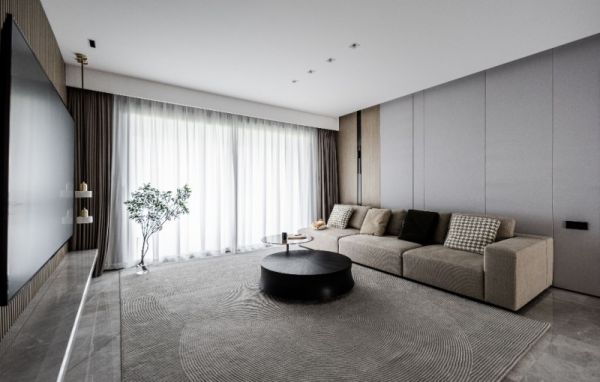 重点墙顶地面不能有突出的调色,灯光不宜太冷,对于大空间更能呈现出极简风格的气势与品质.以简洁和低饱和度的色彩,墙顶地一气呵成,整个平层横厅空间通透大气!
