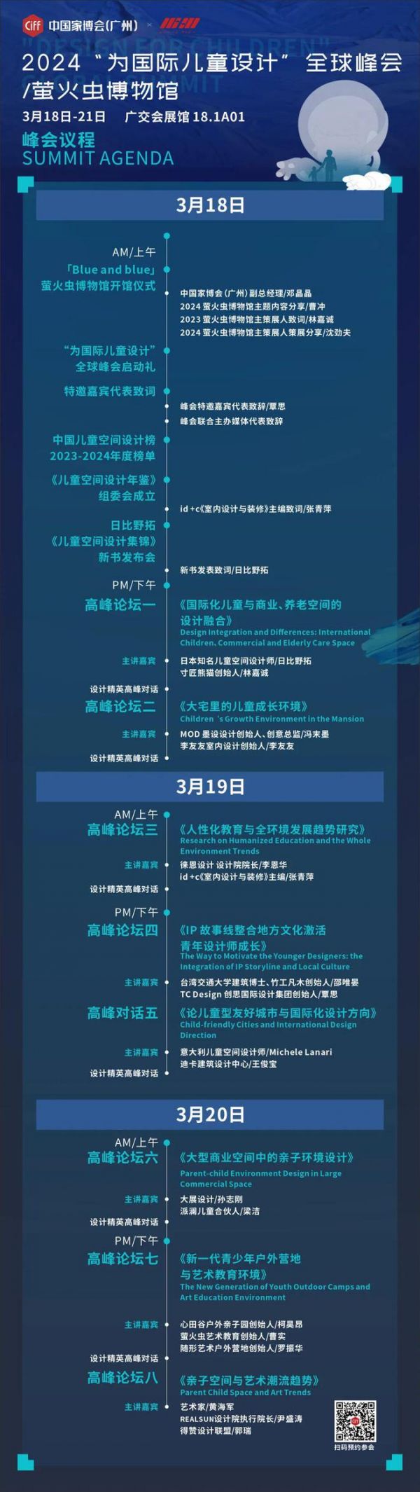 2024年3月18-21日,我们将再度邀请新朋故友,中外设计精英,再聚首2024“为国际儿童设计”全球峰会。我们将邀请中外设计师和跨界儿童专家共同参与,在探讨儿童设计的专业、学术和深度的基础上,在传统的儿童室内空间内容之外,会增加青少年户外环境设计、老幼共融等设计话题内容,力求为未来的儿童设计领域注入新的活力和创意。