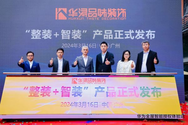 在现场举行的华浔、华为“整装+智装产品正式发布”启动仪式上,华浔品味装饰集团董事长夏振华、总设计师刘晓萍、总裁冷劲松和华为终端大中华区全屋智能TOC业务总经理郭双利、华为终端广东省广州区域总经理段乾坤、华为终端广东省全屋智能总经理孙远航一起按下了启动键。