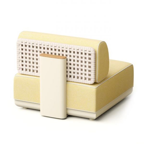 Block沙发给人的第一印象,敦厚而饱满,宽大舒适的体验,能为身心带来彻底的放松,如同一场期待已久的都市漫游,令人向往。它以圆润的方形体块,作为基础规则元素,衍生出单人位、转角位、弧形模块等,可以单独使用,或通过连续的拼接,搭配出灵活就座场景。Block沙发采用拆分式设计,一体化基座,保证了模块系统的稳定性;坐垫在户外海绵的基础上,增加了内置弹簧结构,以达到更好的支撑与回弹效果;带有编织元素的T型靠背,可以加装在基座的任意三侧,靠背底部特殊的固定方式,让它直接伫立于地面,如同公路标识、街巷指示牌般,以不同色彩与质感,表现不同城市的性格特质。此外,精致的柚木装饰与编织样式、颇具功能性的防潮底脚,均从细节出发,在厚实的轮廓中融入细腻的设计语言,强调该系列的整体感。