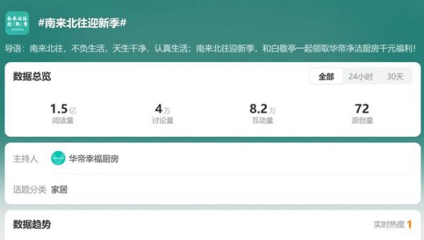 《南来北往》大火之后,颇具热搜体质的华帝携手代言人白敬亭发起华帝“南来北往迎新季”福利活动,并在代言人白敬亭的助攻下喜提热搜。目前,该活动新浪微博话题PV量突破1亿人次,讨论量破4万+,互动量高达8万+。