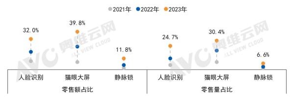 人脸识别:零售额占比为32.0%,较2022年增长13.2个百分点;零售量占比为24.7%,较2022年增长13.0个百分点。