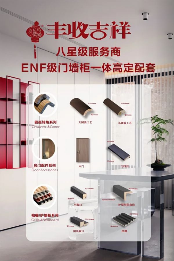 丰收吉祥系列板材不仅符合国家最新环保等级检测标准,更可同色定做圆弧转角、房门配件、格栅和护墙板等配套。