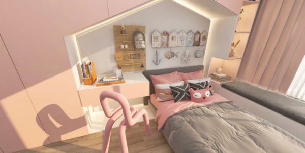 少女粉与海军蓝的搭配调和出舒适的莫兰迪色系,静谧美感