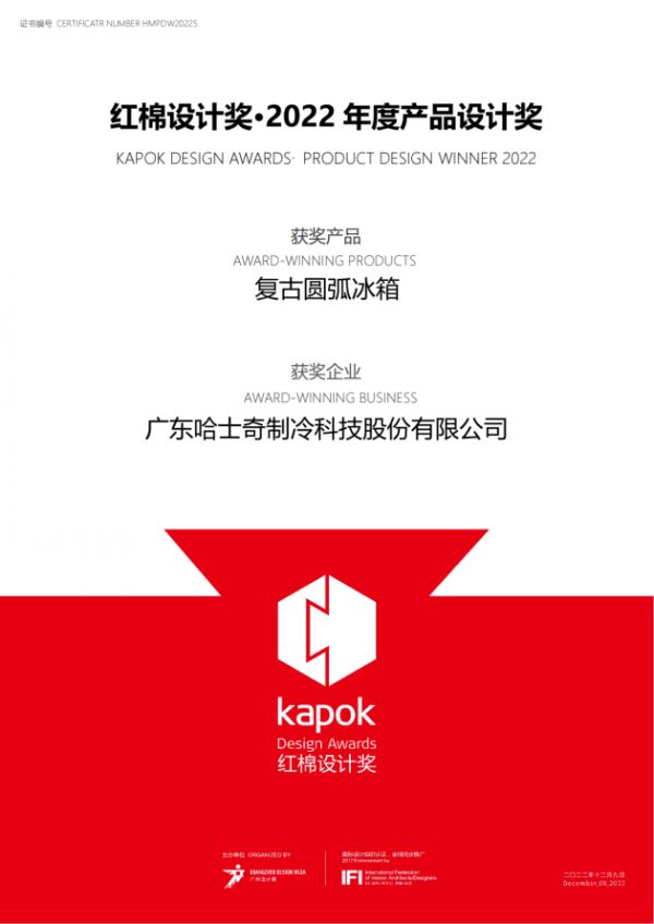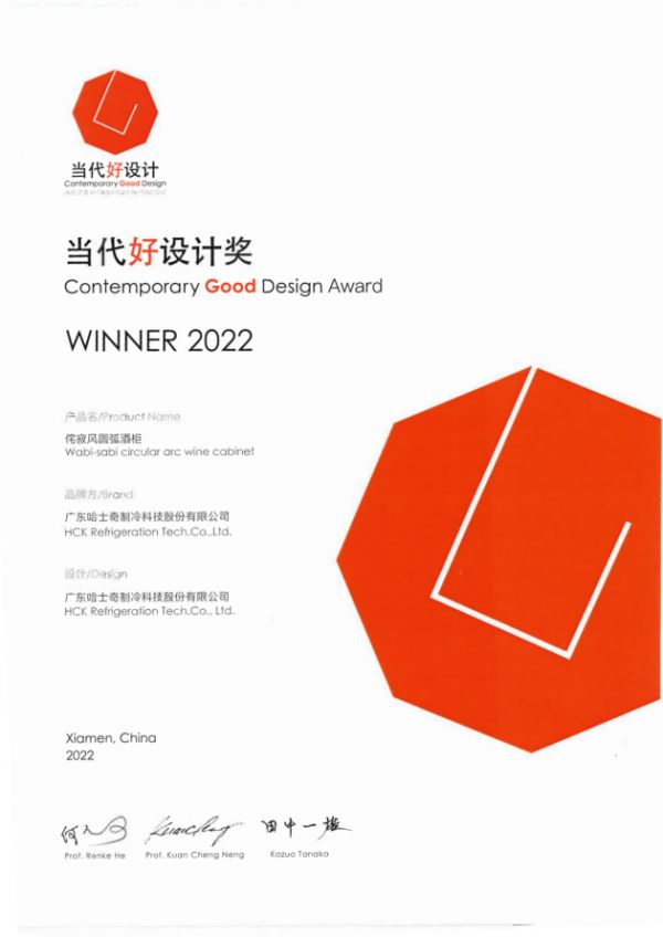 在国际知名设计团队的强势加持下,HCK哈士奇冰吧荣获多项国际设计大奖,比如侘寂风圆弧红酒柜荣获当代好设计奖、复古圆弧冰箱荣获红棉设计奖等。