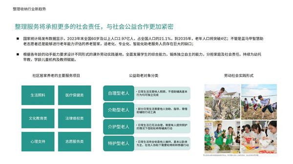 随着老龄化社会的到来,老年人群体对于整理收纳的需求将不断增长。这一趋势不仅为整理收纳行业提供了新的增长点,也为从业者提供了更多的创新空间。