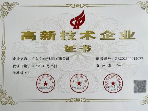近日,广东浪美新材料有限公司凭借在技术创新、产品研发等方面的卓越表现,顺利通过了“高新技术企业”认定。这一认定,不仅是对公司技术水平及研发能力的肯定,也是公司综合实力的体现,是浪美公司高质量发展取得重要进步的标志。