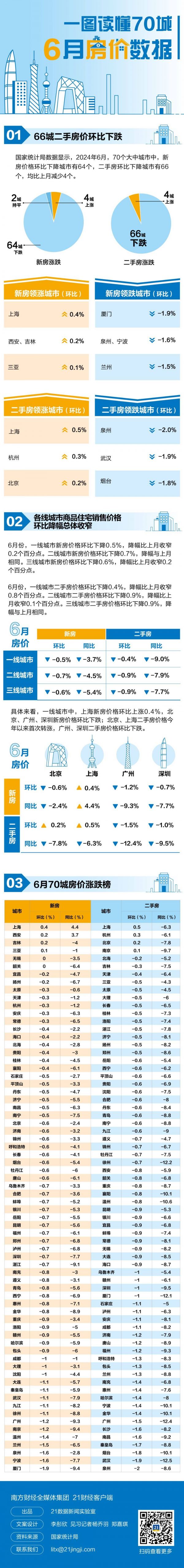 6月份,新房价格同比下降城市有68个,比上月增加1个;二手房价格同比下降城市有70个,与上月相同。