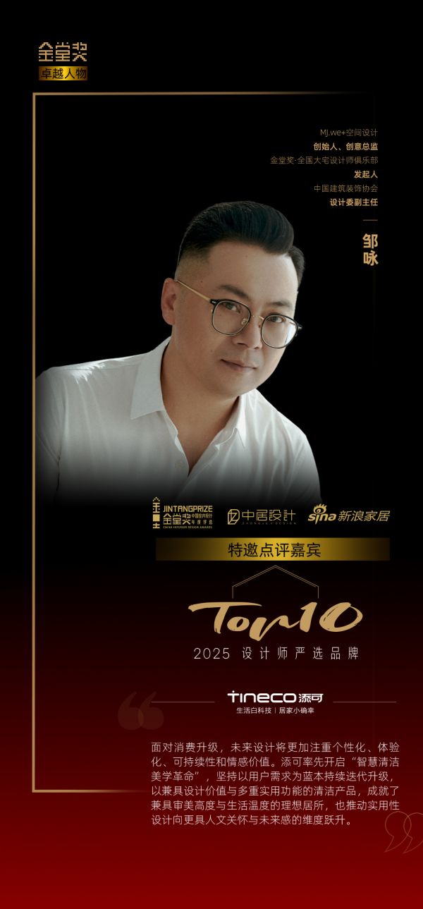 HK MJ.we+空间设计创始人、创意总监,金堂奖·全国大宅设计师俱乐部发起人,中国建筑装饰协会设计委副主任邹咏老师对添可上榜表示祝贺,并点评道:面对消费升级,未来设计将更加注重个性化、体验化、可持续性和情感价值。添可率先开启“智慧清洁美学革命”,坚持以用户需求为蓝本持续迭代升级,以兼具设计价值与多重实用功能的清洁产品,成就了兼具审美高度与生活温度的理想居所,也推动实用性设计向更具人文关怀与未来感的维度跃升。