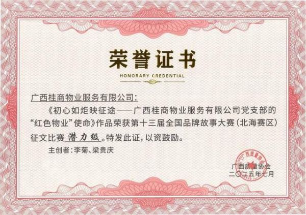 此次斩获两项殊荣,既是对桂商物业品牌文化建设成效的高度认可,也为公司持续深耕品牌、提升品牌价值注入了强大信心。下一步,桂商物业将以此荣誉为动力,不断强化品牌意识,深入挖掘优质品牌,努力讲好品牌故事,为传播企业优质形象增添新动能。