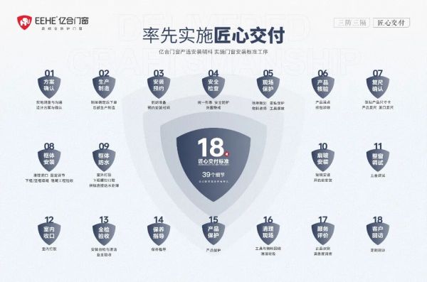 亿合的解法,是在2019年率先实施的“匠心交付”安装服务标准,以18道交付标准、39个细节,从前期方案设计到后期安装服务,覆盖了用户从买到用的全周期。