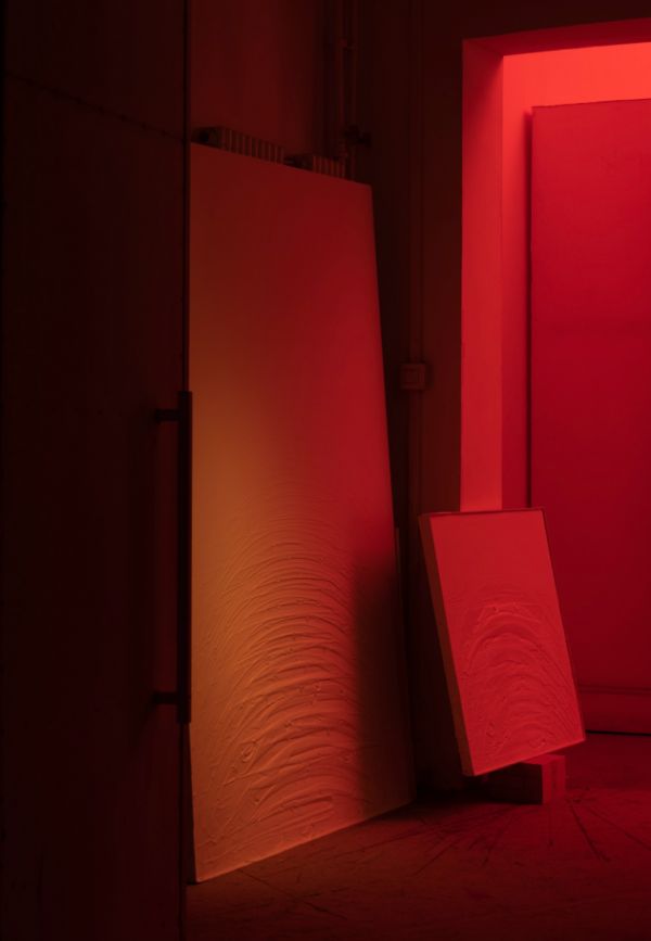改造之前的世界是散乱疏离的,我们用光重构了一个世界,这就是悬浮在半空中的光环的由来。光环向上散发出的光线,弥漫整个工作室。随着色彩的变化,杨黎明在其中不断地穿越,带领着,在他曾经构建的世界中来回跳跃,让人们感受他生命中的轻重、高低变化 。