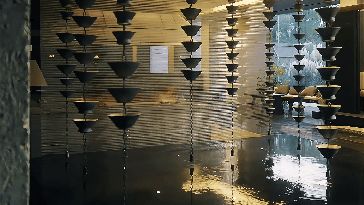 循深径缓行,先闻泠泠水声——邂逅“湖心听雨”声光艺术装置,水珠沿茶盏雨链轻坠,叮咛成音,脆音袅袅回响,涟漪漾平浮躁。