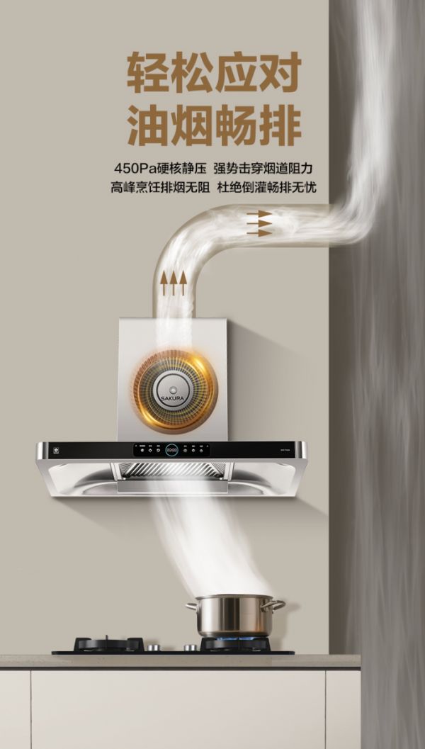 轻松应对公共烟道压力波动,樱花吸油烟机T302A具备450Pa强劲静压,可强势击穿烟道阻力,即使在烹饪高峰期也能确保油烟无倒灌,让排烟畅通无阻。