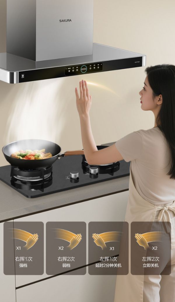 优雅的下厨体验,让生活更美妙,樱花吸油烟机T302A融合科技,采用挥手智控的零接触操控,全程无需触碰面板,挥手就能启停调档,让下厨更便捷、更随心。除此之外,樱花吸油烟机T302A还设置120秒智能延时关机,可彻底吸净烹饪时的余烟废气,让厨房空气焕然如新。