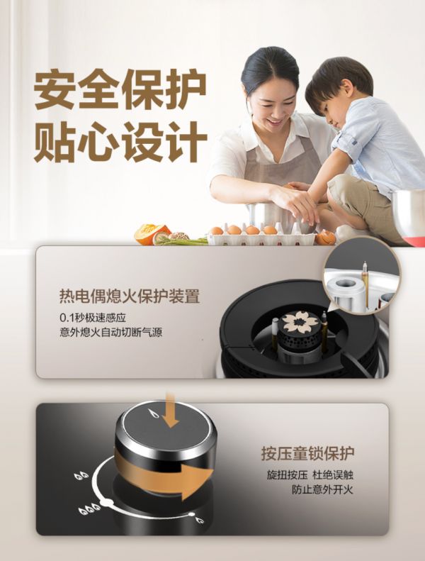 安全,是绝不可妥协的底线。樱花燃气灶S507GA特别旋扭按压的童锁保护,杜绝误触造成的意外开火;另外还搭载热电偶熄火保护装置,能够在0.1秒内敏锐感知意外熄火,并自动切断气源,全面杜绝燃气泄漏风险,守护家的每一刻安宁。