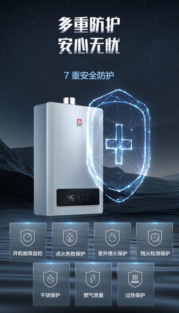安全,是品质生活的底色。樱花燃气热水器Q303内置七重安全防护系统,包含开机自检、点火失败保护、意外熄火保护、残火检测、干烧保护、燃气泄漏报警、过热保护。无论使用前还是使用中,安全都始终伴随左右,让每一次沐浴都无忧。