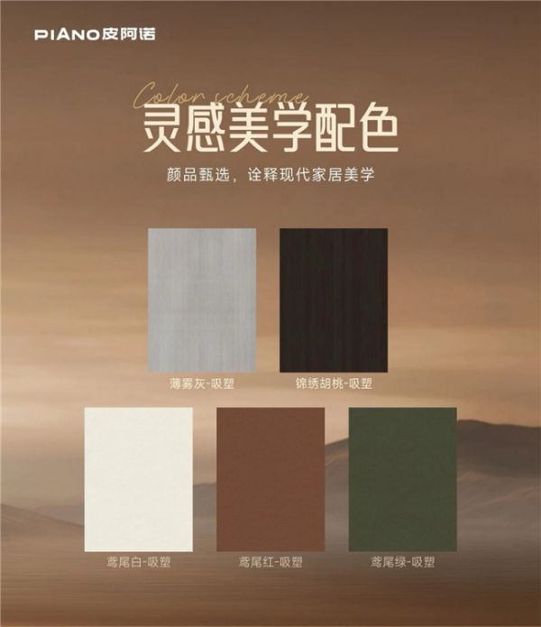 为满足不同消费者的审美需求,皮阿诺缪斯全新吸塑系列提供五大 “灵感美学配色”—— 薄雾灰、锦绣胡桃、鸢尾白、鸢尾红、鸢尾绿。从清新淡雅到温润沉稳,从明亮鲜活到低调内敛,多元配色可适配现代简约、轻法式、温馨复古等多种家居风格,为家居整体搭配提供更多可能性,轻松诠释现代家居美学。