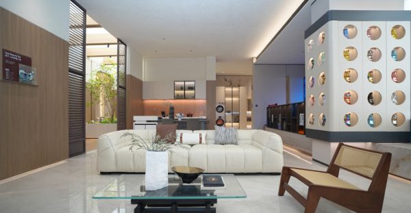 李莹认为,装修不应局限于单一材料,而应从空间整体性出发进行搭配,才能营造出层次丰富的视觉效果。也正因为运用了多种材料,叠加人文艺术方面的融合,萨米特新展厅打破了传统瓷砖展厅的冰冷印象,传递出温暖、舒适、灵动且多彩的真实家居氛围,消费者完全可以直接将展厅场景“复制”到自己家中。