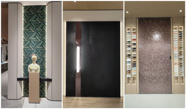 在萨米特新展厅中,新明珠绿材的绿色产品展现出极强的兼容性。墙板产品表面有木纹、布纹、石纹、水泥、金属、马赛克、丝绒和镜面等多种材质的表现,折弯圆弧等工艺简单实现空间造型。软瓷也通过不同的工艺技术,实现饰面材料的更多元可能。