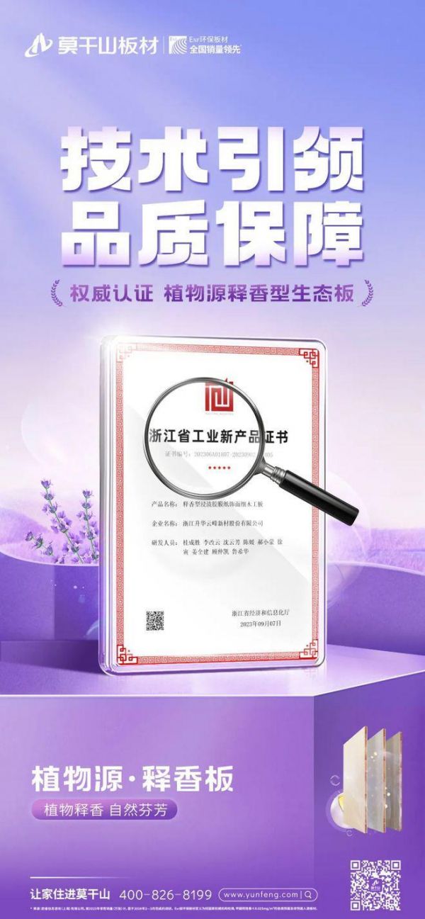 莫干山板材洞悉此趋势,以绿色健康为魂,创新引领“香氛家居”潮流;以自然花香为媒,为居家生活增添一抹雅致与清新,匠心独运,推出植物源·释香板,并经省级工业新产品技术鉴定,认为该产品属于国际先进,首家研制。