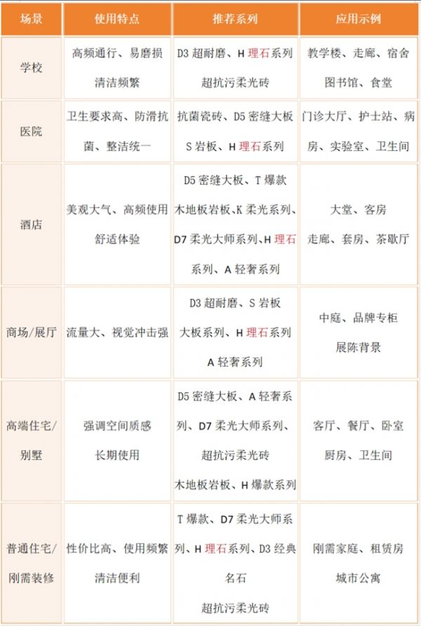 一表看懂大角鹿瓷砖典型应用场景推荐: