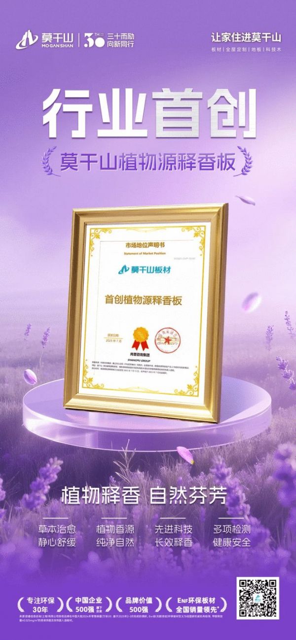 当家居消费从“功能需求”转向“情绪价值”,莫干山板材以植物源技术交出了一份创新答卷。早在2023年,莫干山植物源释香板就通过了省级工业新产品技术鉴定,被认定为国际先进成果,同时也是国内外首个实现“人造板长效释放天然植物香气”的创新产品。此前,尚普咨询更认证莫干山板材“首创植物源释香板”身份,并出具《市场地位声明书》。植物源释香板不仅标志着云峰莫干山在板材功能创新上的领跑地位,更为家居行业开辟了“功能+情绪”的全新赛道。