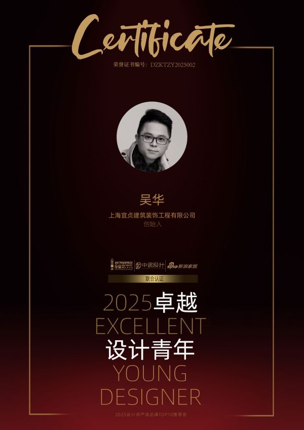 经主办方严格评审,本届荣膺“2025卓越设计青年”称号的是——上海宜贞建筑装饰工程有限公司创始人吴华。