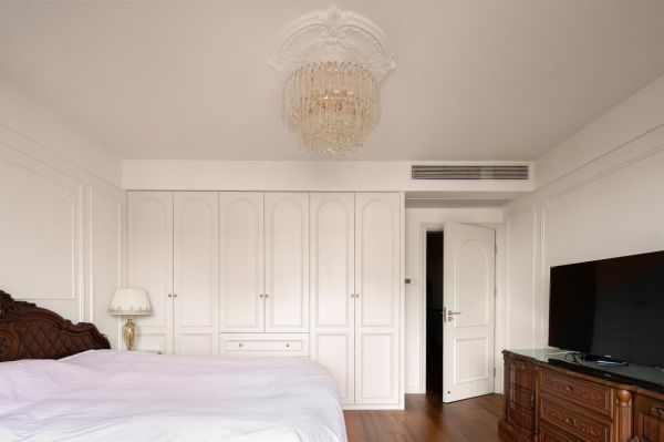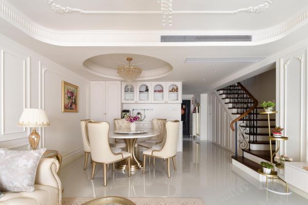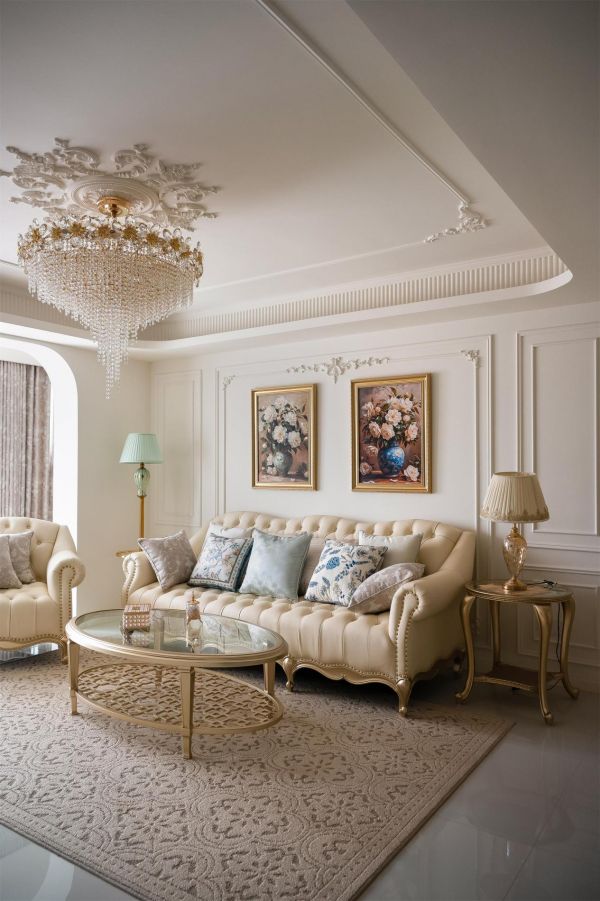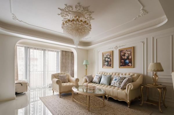 硬装:硬装是奠定空间风格的骨架。墙面作为视觉重点,摒弃冷调大白墙,通刷奶油色乳胶漆以烘托温柔基调,并大量运用纤细款石膏线于墙面勾勒护墙板效果,天花则适配雕花灯盘,营造精致感。地面首选浅色木地板以人字拼或鱼骨拼铺设,增强空间延伸感与法式韵味;亦可选用柔光暖灰色系的仿古砖或大理石瓷砖。天花板摒弃复杂造型,以简约的钢琴键石膏线走边结合圆弧吊顶,再搭配一枚精致石膏灯盘,便能轻松渲染法式氛围。门窗方面,于客厅与阳台、走廊等过渡处设计拱形门洞,作为法式灵魂元素,能瞬间提升整体的艺术气质。