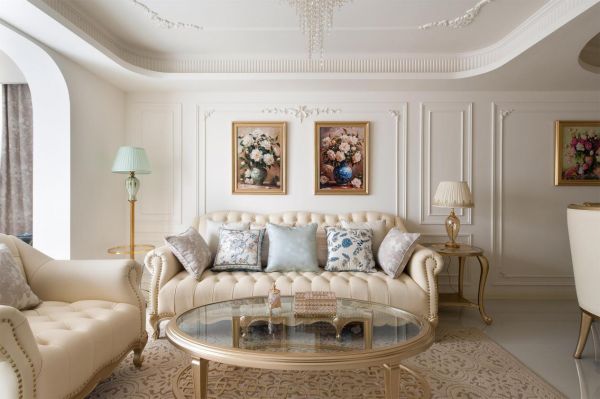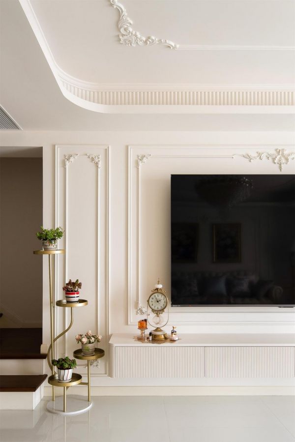 家具:家具选择上,沙发应以线条圆润、造型柔软的款式为主,如模块沙发、羊羔绒或布艺沙发,颜色优选米白、浅咖等浅色调,避免方正笨重的设计。单椅可搭配带有藤编元素的扶手椅或线条优美的昌迪加尔椅;茶几则推荐云石圆几或木质藤编组合茶几,造型以圆形、椭圆形为佳,以规避锐利棱角。电视柜与边柜宜选用造型简约、带有细腿的浅色木制柜体,也可直接以法式经典壁炉作为视觉中心,兼顾装饰性与氛围营造。