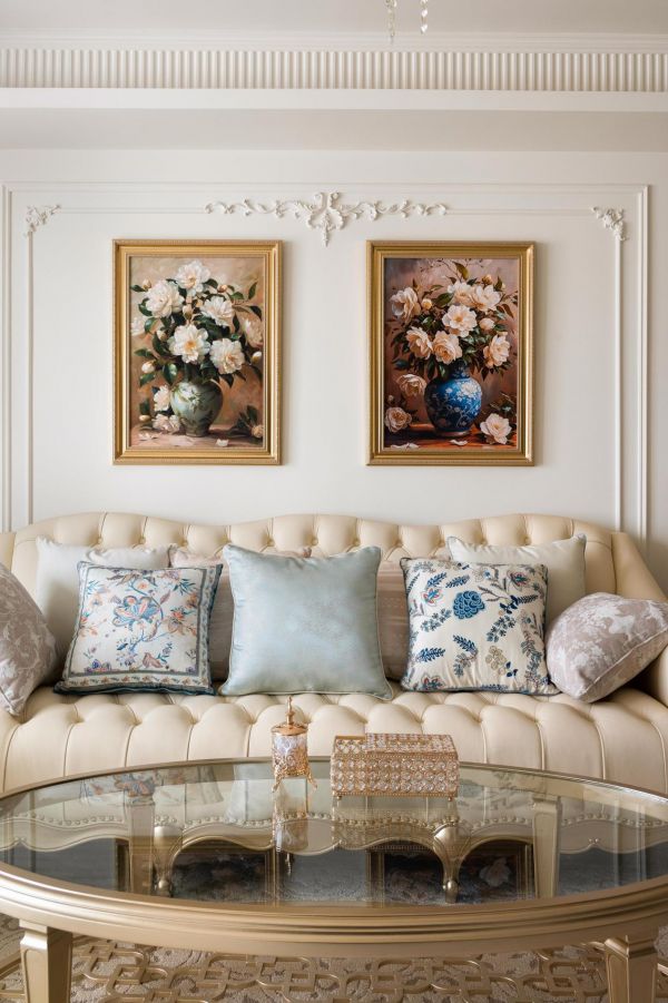 软装点缀:软装是营造空间氛围的关键。窗帘首选双层纱帘,当阳光透过时能形成梦幻柔和的光影效果;外层可搭配同色系的亚麻或绒布窗帘以增强层次。地毯宜选用浅色短绒款式,带有微妙肌理或隐形花纹,低调而不失质感。灯具方面,主灯可选择造型简约的水晶吊灯或纸质吊灯,辅以壁灯、落地灯等辅助照明,如安装在石膏线背景墙上的壁灯,或草裙灯、百褶灯等热门款落地灯,共同构建丰富的光影层次。装饰品可选择大幅复古线条画、雕花镜子、陶瓷花瓶、干花或鲜花如郁金香和尤加利叶,以及烛台、法文书籍等元素,细腻点缀空间,延续法式奶油的精致与治愈氛围。