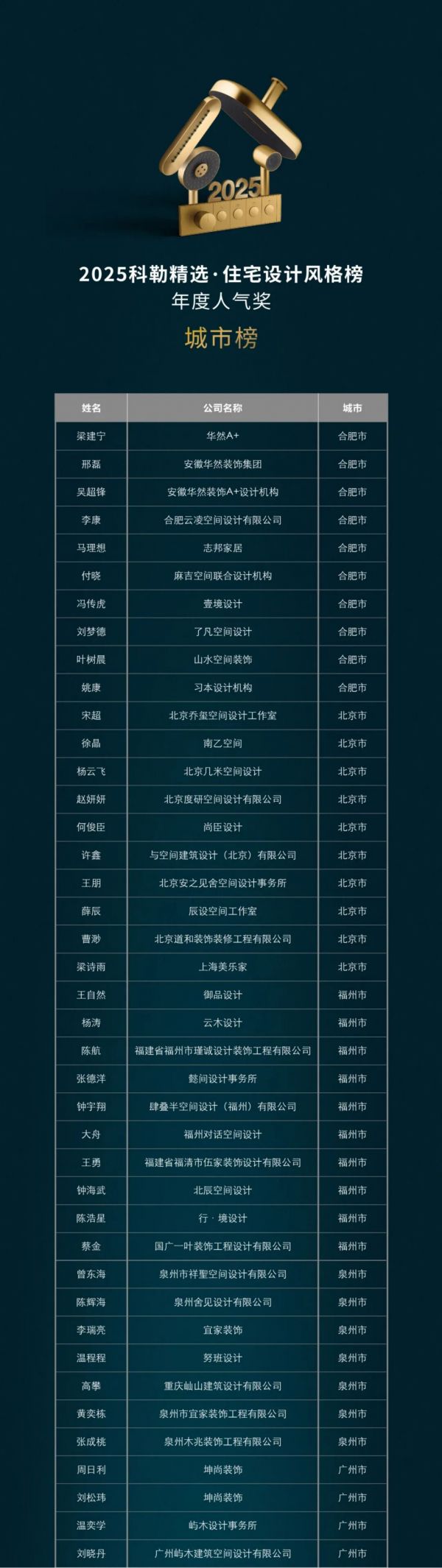 再次祝贺所有“2025科勒精选·住宅设计风格榜”(作品榜)年度人气奖的获奖者。接下来,入围作品将由设计推荐官进行线上评审,累计评分在省区TOP10的作品可获2025科勒精选·住宅设计风格榜(作品榜)“年度优胜奖”获奖证书。精彩待续!