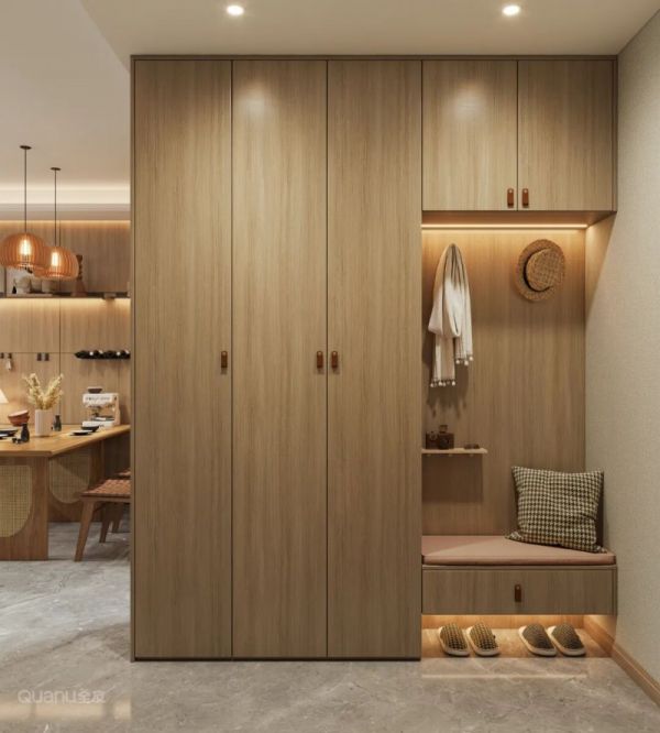 在玄关柜中预留宠物用品收纳区,柜体中层预留牵引绳挂钩,下层放置宠物外出包和清洁用品,同时设置开放格和抽屉,方便随手取用。