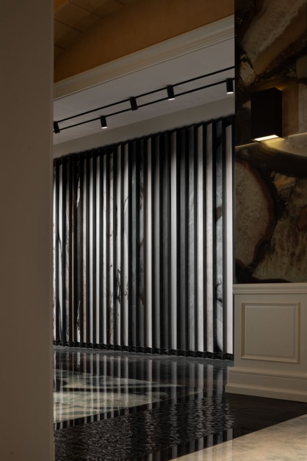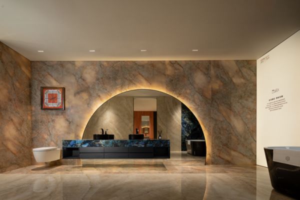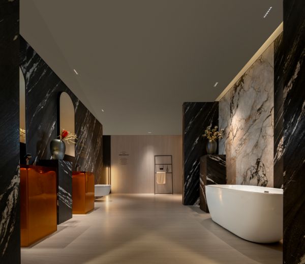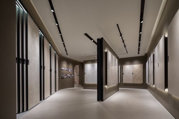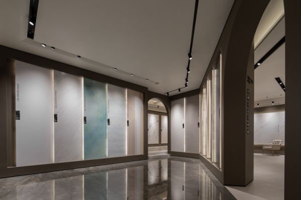 在展厅的产品展示区,伊派・爱马仕的瓷砖与岩板以 "融绘" 的方式呈现,打破传统瓷砖展示的单一性:哑光与亮光、粗糙与细腻、冷硬与温润的材质在此和谐共处,展现品牌 "Mix&Match" 的核心理念。