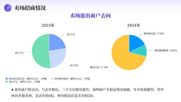 退出商户的去向,与去年相比,三个方向都有提升,说明商户不稳定情况加剧,争夺更加激烈。其中转向其他卖场,是去年的4倍,转向街边店是去年的2倍。