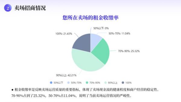 租金收缴率是反映卖场运营质量的重要指标,体现了卖场现金流的健康程度和商户经营的稳定性。70-90%占到了25.32%,50-70%占11.04%,说明了当前卖场运营情况的严峻性。