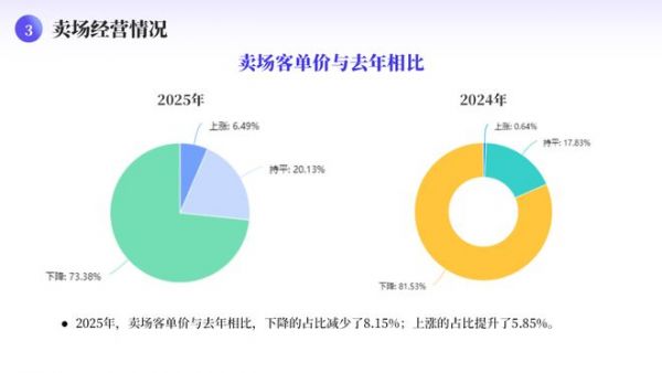 2025年,卖场客单价与去年相比,下降的占比减少了8.15%;上涨的占比提升了5.85%。