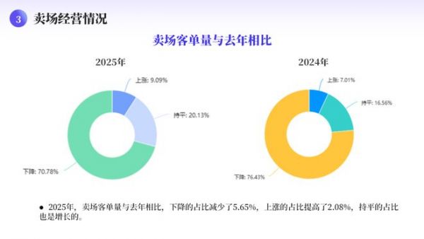 2025年,卖场客单量与去年相比,下降的占比减少了5.65%,上涨的占比提高了2.08%,持平的占比也是增长的。