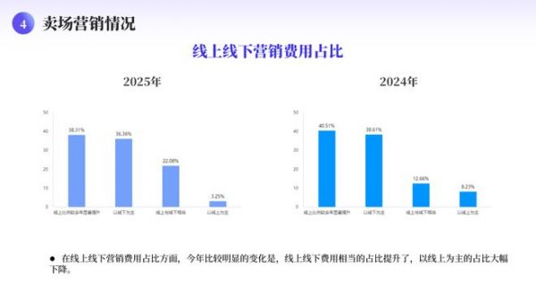 在线上线下营销费用占比方面,今年比较明显的变化是,线上线下费用相当的占比提升了,以线上为主的占比大幅下降。