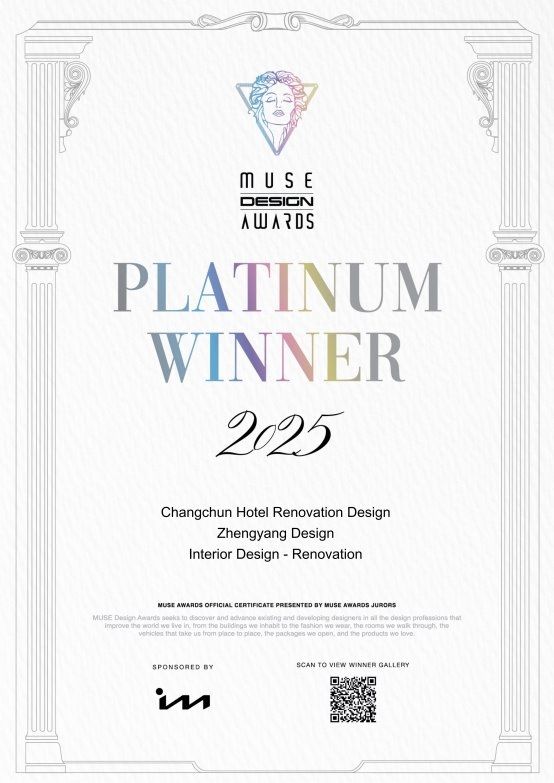 近日,全球性知名奖项赛事-美国缪斯设计大奖和伦敦国际设计大奖公布了2025年度获奖名单,来自全球22个国家的知名设计专家组成的评审团,以盲审的形式,按照严格的专业标准从来自全球46个国家的6000多份参赛作品中选出获奖作品。由正阳设计机构的秦迪老师设计作品《长春宴》从全球众多作品中脱颖而出,荣膺2025伦敦国际设计大奖最高等级-铂金大奖、《长春宾馆改造设计项目》斩获2025缪斯设计大奖最高奖项-铂金大奖,专业实力得到国际奖项的认可,受到来自全球专业设计领域的高度赞赏!