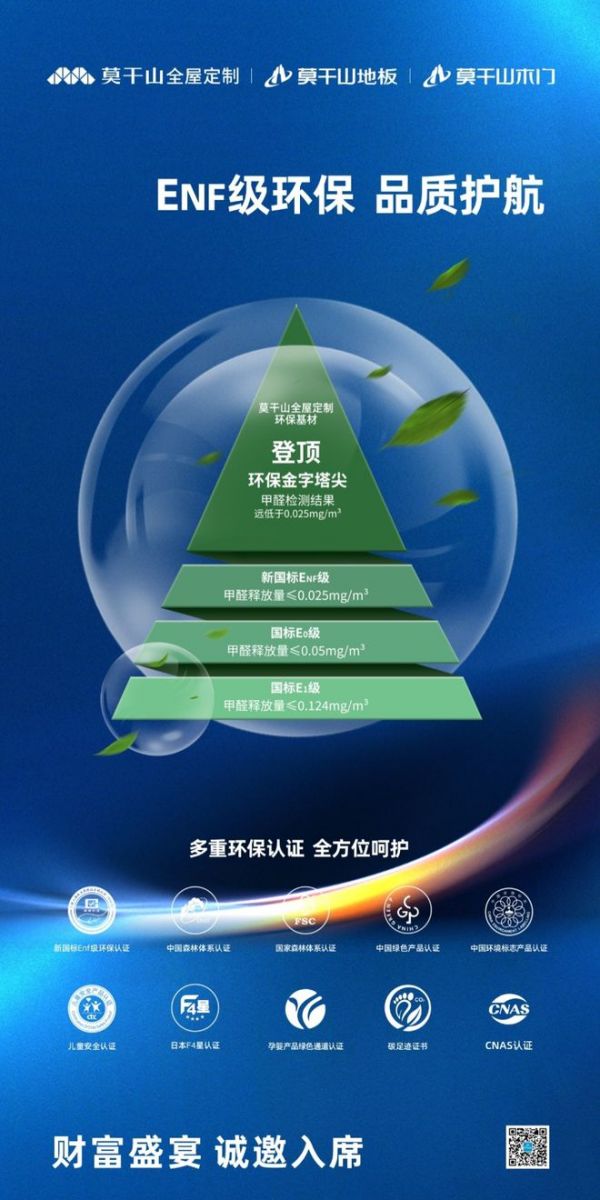 环保是全屋定制的生命线,更是莫干山的核心竞争力,是莫干山与生俱来的DNA。作为中国“第一张环保板材”的缔造者之一,莫干山大家居拥有ENF级、母婴级、日本F4星等八大权威认证,打通美日中三国环保标准,让您在市场竞争中手握“环保王牌”,赢在起点。