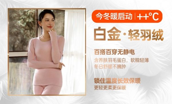 纯棉居物坚持,真正的温暖应当轻盈如羽、柔软如云、贴身如肤。「白金·轻羽绒」系列保暖衣从材质源头革新,融合多项科技成果,实现“轻、柔、暖、润”四维一体,颠覆消费者保暖认知。