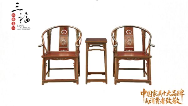 2014年9月,三福《明式交椅》作为首件国礼赠予塔吉克斯坦总统。其月牙扶手以五节榫接成型,线条流畅自然,后背椅板三截攒成,充分体现明式家具注重人体功能的设计理念。三福艺术家具董事长黄福华感慨道:“这把交椅开启了三福的国礼之路,也让我们更加明确肩上的责任。”