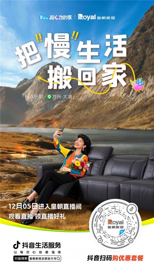 2025年12月5日,皇朝家居联合抖音生活服务,在苏州西山岛打造一场为期14小时的“总裁价到”超心动直播盛典。本次直播以“把慢生活搬回家”为主题,深度融合自然场景与家居美学,旨在为用户带来一场沉浸式的“湖山松弛”体验,传递皇朝家居“自然舒适、松弛有度”的品牌理念。