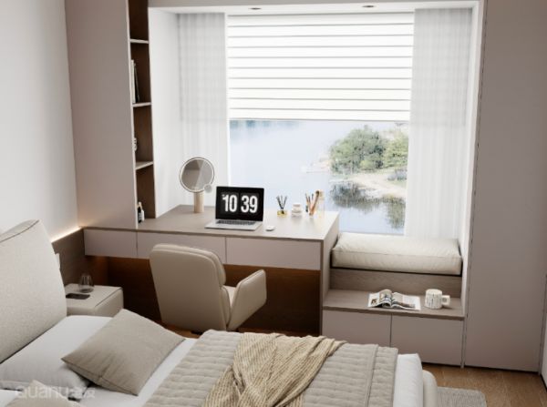 利用飘窗打造梳妆台,左侧开放格、中部抽屉满足日常收纳需求,右侧连接踏步卡座,并在卡座下方设计大容量储物柜,将梳妆、收纳与休闲功能整合于一体。