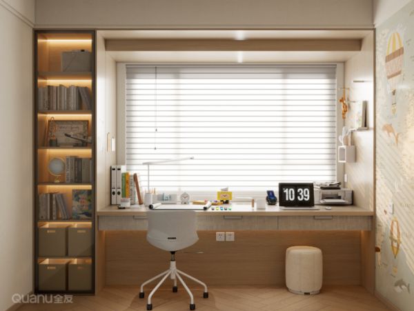 沿飘窗定制书桌柜,不仅能充分利用窗边的优质采光,还能省下一个书房的空间。搭配到顶分层书柜与洞洞板,藏书展示与文具收纳两不误。
